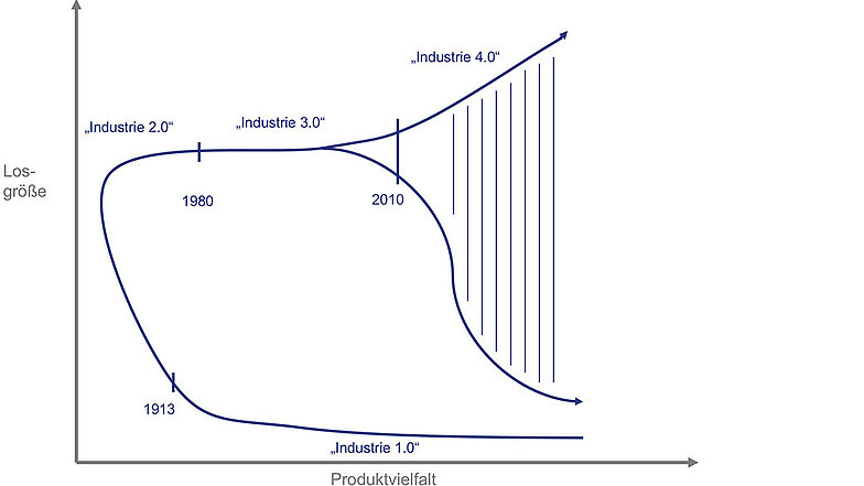 Die digitale Ära setzt zwei wesentliche Trends in Gang: Zum einen entstehen immer größere Betriebe, die durch Skaleneffekte bei geringer Produktvielfalt wirtschaftlich produzieren. Zum anderen differenzieren sich kleinere und flexiblere Werkstätten aus, die ihre Produktionsanlagen teils sogar für jeden Kunden individuell anpassen (Abbildung 1). In diesem Kontinuum möglicher Wertschöpfungskonstellationen entstehen für die Betriebe vielfältige Optionen, sich mithilfe digitalisierter Prozesse schneller an die sich wandelnden Anforderungen der Kunden anzupassen. Gleichzeitig wächst aber auch der Kostendruck aufgrund des globalisierten und kompetitiven Marktes. Wer frühzeitig in Automatisierung investiert, kann seine Fertigung zukunftssicher aufstellen und Effizienzgewinne schnell in Wettbewerbsvorteile umsetzen.